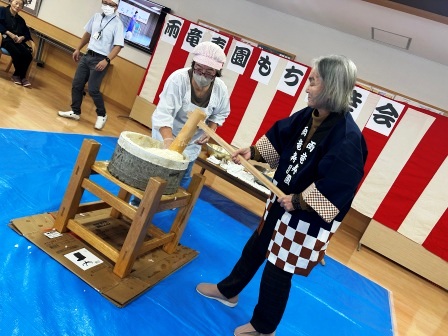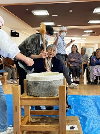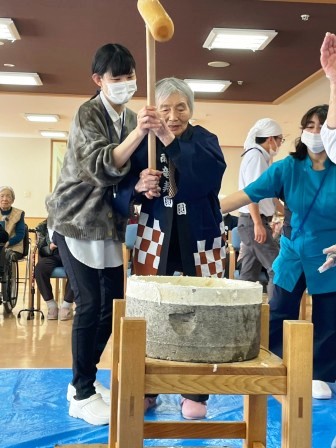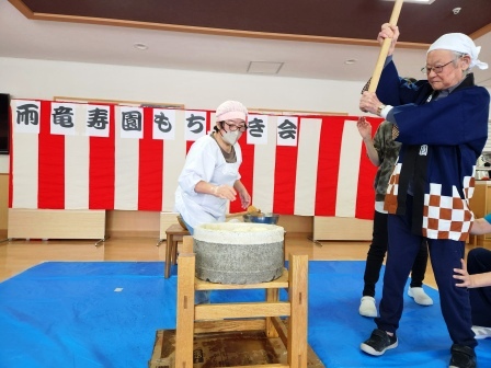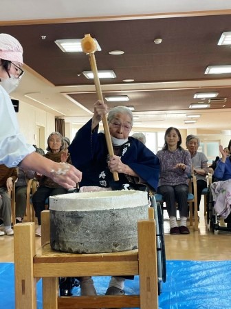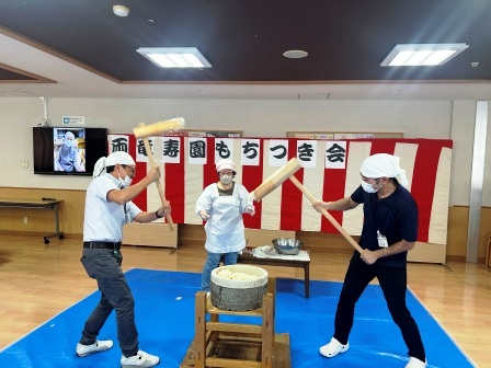 もちつき会を開催しました 昨年までコロナ禍で実施できていませんでしたが、今年はもちつき会を開催できました。大きなかけ声と共に、皆さんで2臼つきました。つきあがったおもちは鏡もちとして、施設内に飾りました。