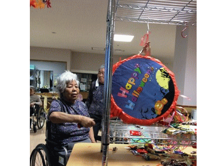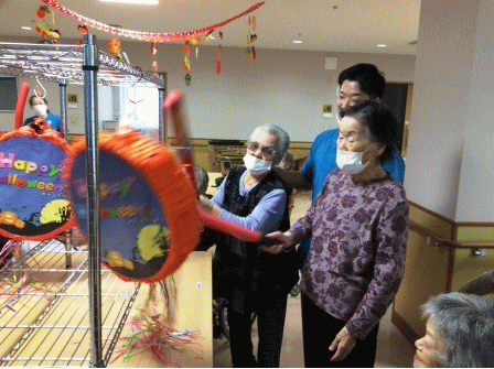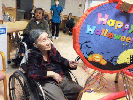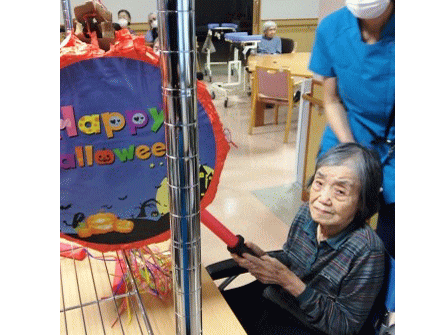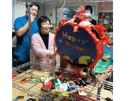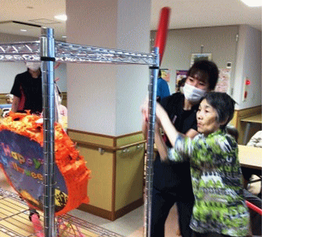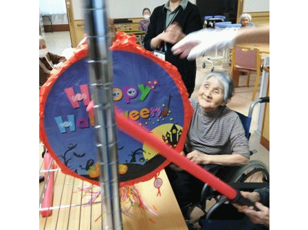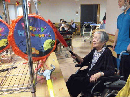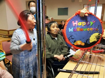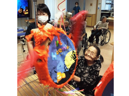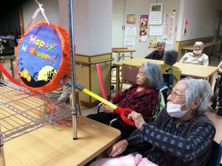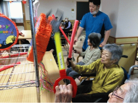 ハロウィン ハロウィンにちなんで、お菓子の入ったピニャータ(くす玉)を、棒で叩いて、中のお菓子を皆さんでいただきました。 棒が柔らかかったので、いくら叩いてもお菓子が出てこなくて大苦戦…汗 皆さん、汗だくで、大笑いしながら、くす玉を叩いて、何とかお菓子を取り出すことができました。
