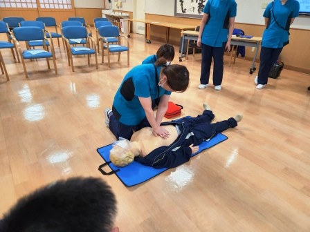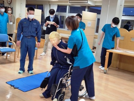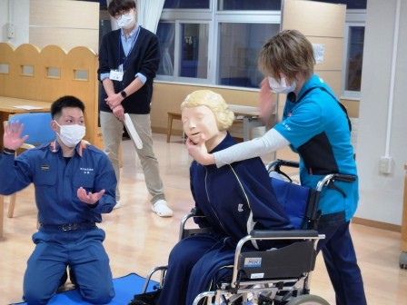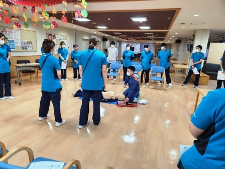 事故防止研修会(救命講習) 滝川消防署江竜支署より職員の方をお招きして、研修会を開催しました。 当日は心肺蘇生法やAEDの使用方法、のどつまりの対応など、利用者さんの生命を守る為に必要な内容を、実技を交えて研修しました。 定期的に内部研修をおこない、自己研鑽に努めています。
