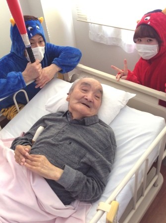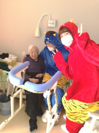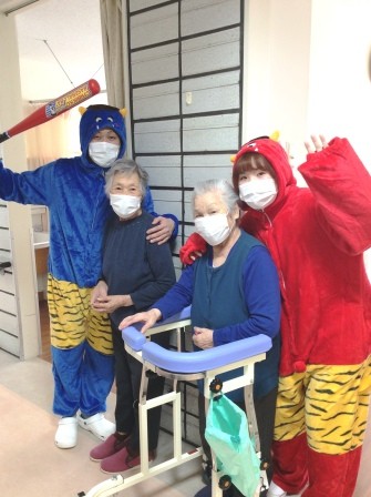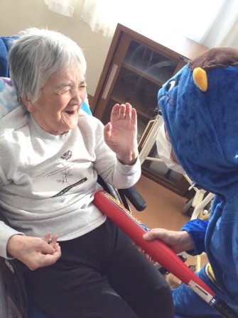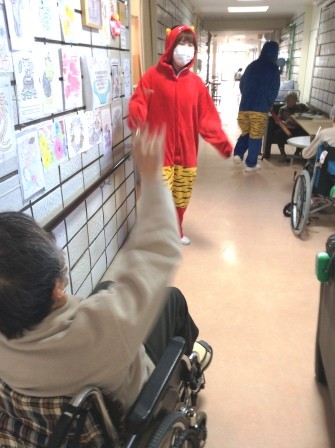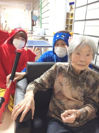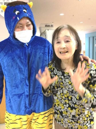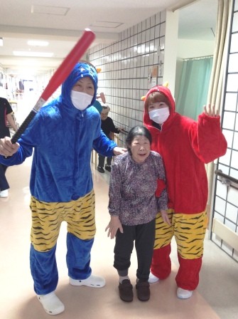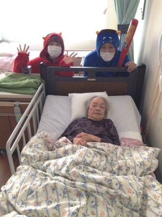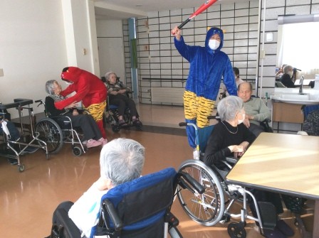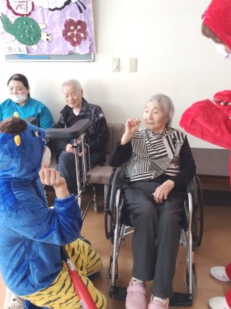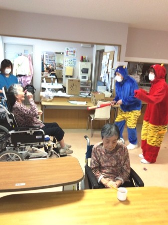 赤おに、青おにがみなさんを訪問し、豆まきをおこないました。